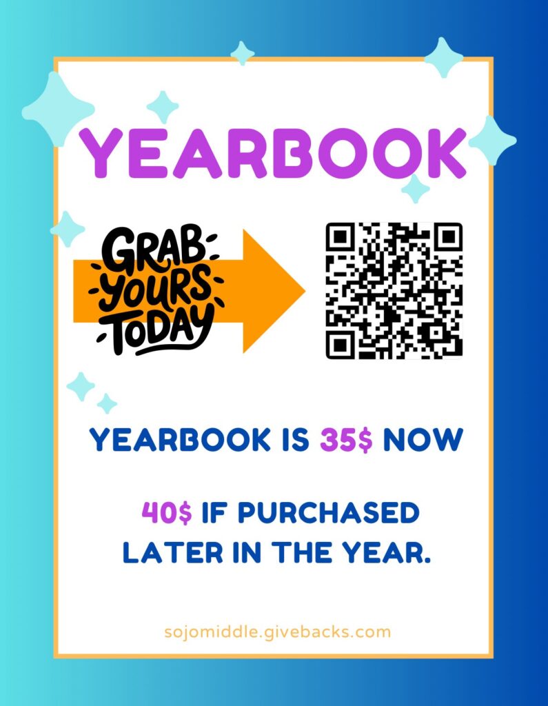 Hey! Remember to buy your yearbook before Friday! There are QR codes in the hall and by the front office! Send them to your parents. You’ll be entered into a drawing for gift cards and candy at lunch!