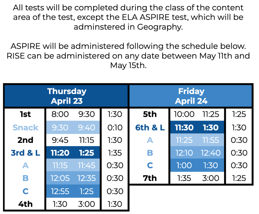 9th-grade students will participate in ASPIRE testing on April 23rd and 24th. 8th-grade students will complete their Writing portion of the RISE. All other RISE testing for 7th and 8th will be later, we will send an announcement closer to the testing date. We will have an accommodated bell schedule on both of those days to allow time for testing.